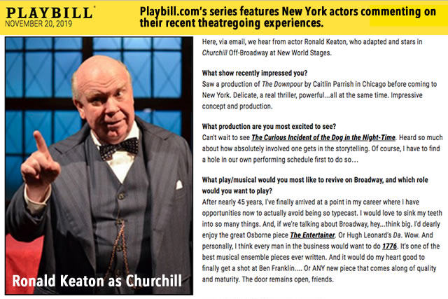 After the Chicago triumph, Churchill opened a successful run off-Broadway, at the Shubert owned New World Stages beginning in February. The originally limited run was immediately extended an additional eight weeks due to ticket demand. It wasn’t long till it was extended yet again till mid July. After garnering favorable reviews and attention from publishers, licensing groups and touring agencies, Churchill closed its New York production on July 12.
